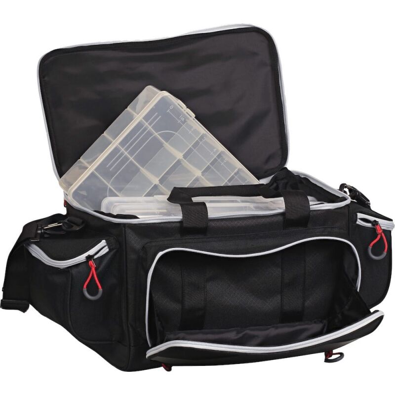 Die praktische Ausstattung dieser Angeltasche lässt keine Wünsche offen. Im Lieferumfang sind vier vielseitige Boxen enthalten, die Ihnen helfen, Ihre Köder und Zubehörteile übersichtlich und griffbereit zu verstauen. Eine große Fronttasche mit Netzinnenfach sowie zwei Seitentaschen mit elastischem Werkzeugorganisator bieten zusätzlichen Stauraum und perfekte Ordnung für alle notwendigen Utensilien.